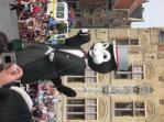 The final two figures in the parade, festival mascots that always come last, are a male black-and-white tuxedo cat named Cieper, dressed appropriately in a tuxedo and top hat followed by his white and white-attired bride, Minneke Poes. These figures are larger-than-life, perhaps 20 feet tall, as tall as the top row of the bleachers. This cat-themed spectacle was not limited to the paraders. There were several groups of tourists, some Japanese, sitting in the bleachers and many of the women in these groups had elaborately made-up cat faces, as though they had just finished performing in ‘Cats’. After the parade ended, Puss-in-Boots wandered through the crowd, allowing himself to be photographed with interested spectators; several older Japanese women – without the cat-face makeup –