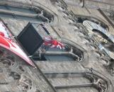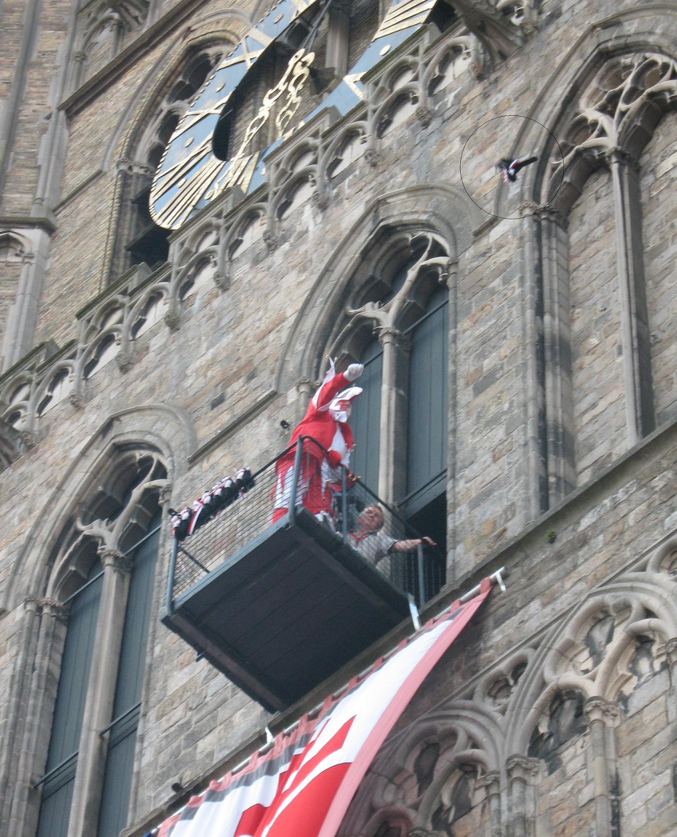 all the cats tossed now are the stuffed animal kind. With the crowd gathered on the street below, the court jester appeared on the balcony of the Cloth Hall, high above the square. He strutted and posed and pranced for the crowd. The jester urged the crowd to make