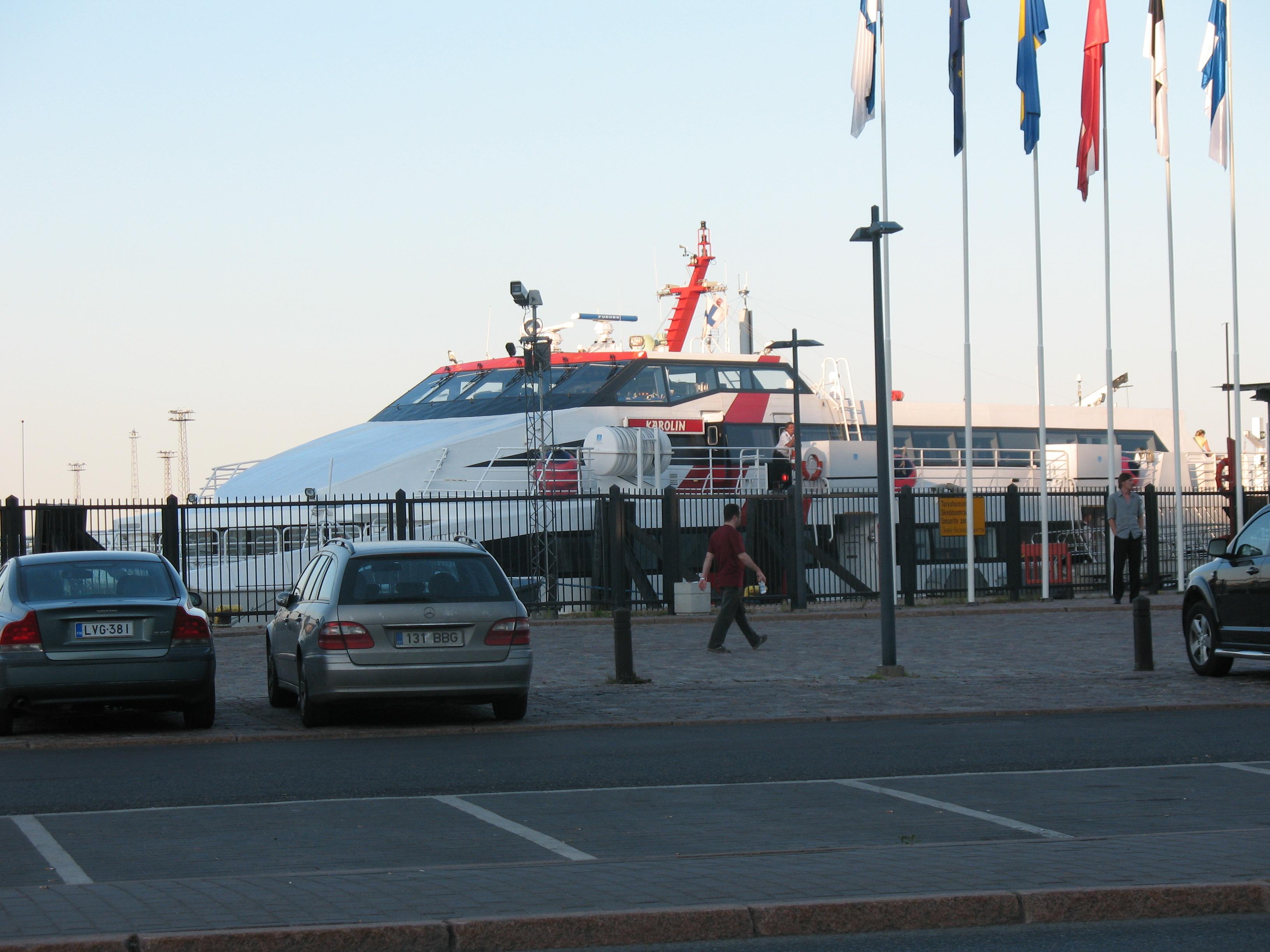 OK. By now it was time to figure out how to get back to the ferry port to get the hydrofoil for the return trip to Helsinki. I walked back to the bus stop where we were dropped off but there was nothing to indicate any bus, public or otherwise, that went to the ferry terminal. I tried asking a bus driver but he spoke no English so I just apologized and thought about a plan B. The harbor area is less than a mile from the old town, but there was no walkway or sidewalk linking the two. There was a snack shop nearby and the girl at the counter told me there was a taxi rank around the corner. Sure enough, I found the taxis and a cabbie who knew enough English to understand where I wanted to go and tell me what the fare would be. We had an enjoyable if somewhat basic chat in English. The fare ended up costing more than I had in Estonian, so I paid in euros. I’m sure the guy made out on the deal, but I figured the money would go further for him than for me. I don’t see any point in getting stressed out with occasionally overpaying for something when I travel. I just try to make sure I’m not overpaying a whole lot and doing it only rarely. And I like to KNOW that I’ve done it.