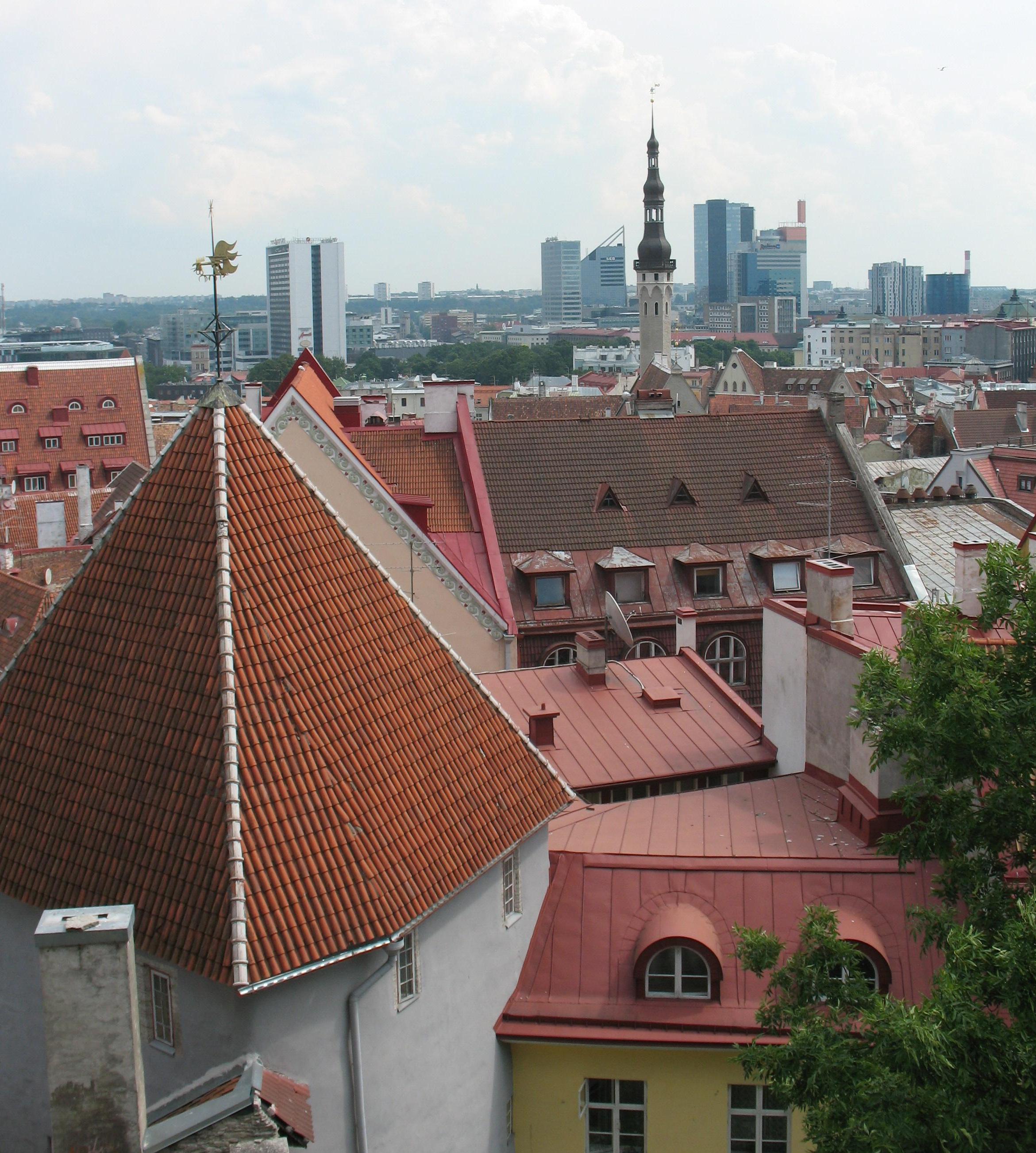 Not only are the red-tiled roofs of the old town visible, but also the new glass and steel office buildings. The harbor area on the Gulf of Finland was visible off to the side.