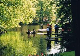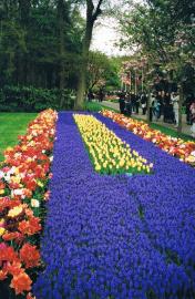 Keukenhof runs from mid-March to mid-May each year (March 22 thru May 20 in 2012). To ensure the gardens are filled with flowers whenever you visit, a small army of gardeners is constantly digging up spent bulbs and replacing them with others on the verge of bursting open. Other beds are at their peak and all come with a varietal nameplate so you can order them for your garden. Bulbs are planted not in dozens but in hundreds, even thousands. Some beds are laid out in regimented squares or rectangles; in others, bulbs huddle together in naturalized clumps. Patterns are easier to see when you squint at a seemingly random mix of colors and see that they intertwine, forming a huge braid that borders the stream for several yards. The designs are stunning and if there is duplication, it’s hard to pick out.