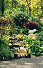 Sculptures of all kinds are scattered around the grounds. Some nestle coyly in the flower beds, others are centers of attention. The largest of these artworks, including a scaled-down windmill, beg for interaction. A pair of oversized tulip bulbs are too slick to climb on, but are a perfect place to perch children for a photo. A path of stepping stones leading across a stream is an engaging detour.