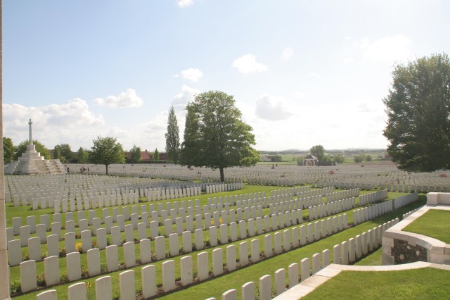 Astoundingly, the cemetery at Tyne Cot is only about 8.6 acres, where Colleville-sur-Mer, with 1500 fewer graves, covers more than 170 acres. Looking at the photograph, the saturation of Tyne Cot’s ground with headstones mimics the close quarters of the slaughter itself.